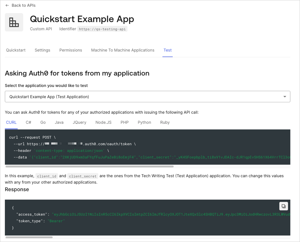 To make calls to your API, you will need an access token. You can retrieve an access token for testing purposes from the Test view in your API settings.
